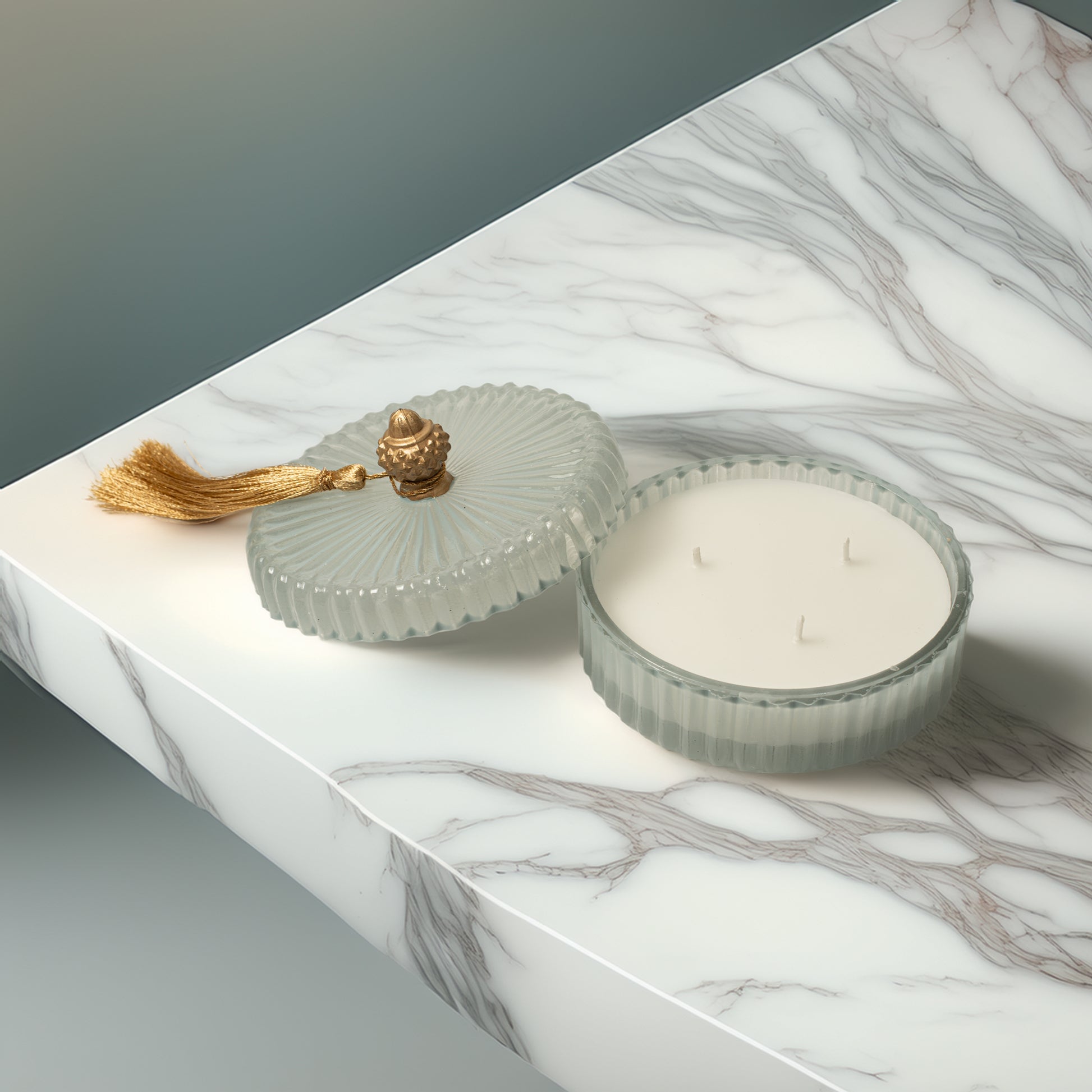 Grand Fluted Aura Bowl Candle with Tassel on top Lid A magnificent, wide bowl candle with a distinct, deep fluted or wavy-ribbed pattern and multiple wicks, designed for a significant aromatic and visual presence. Available in various colors.